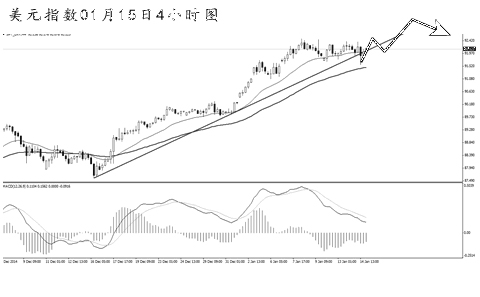 由于連續(xù)幾個月對金融市場造成“劇烈震動”,美國零售銷售數(shù)據(jù)已經(jīng)成為繼非農(nóng)數(shù)據(jù)后又一個“恐怖數(shù)據(jù)”。本周公布的美國零售銷售數(shù)據(jù)意外大幅下滑推動美債收益率大跌,導致美元指數(shù)短線急挫,同時也令油價收獲逾兩年來的最大單日漲幅。美國商務部周中公布的數(shù)據(jù)顯示,美國2014年12月零售銷售月率大幅下滑0.9%,遠低于市場預期的下降0.1%,較上月的增長0.7%更是相距甚遠。美國零售銷售遭受重挫主要與汽油價格的明顯下降有關(guān),但在12月這個零售業(yè)通常最為繁忙的月份,多數(shù)零售店的銷售卻出乎意料的疲軟。由于該數(shù)據(jù)令人失望,市場進一步推后美聯(lián)儲首次加息的預期時間,此前很多分析認為美聯(lián)儲會在6月加息。我們認為,此次公布的零售銷售數(shù)據(jù)可能因為季節(jié)性因素而失真,并沒有真實反映美國零售銷售的情況,不過,市場可能還是需要數(shù)據(jù)有明顯改善,才能恢復對美聯(lián)儲預期的信心。目前我們預計美聯(lián)儲今年仍然會加息,但具體時間可能會推后。此前,美國聯(lián)邦基金利率期貨走勢顯示市場預計美聯(lián)儲在6月或7月加息,但許多投資者目前相信美聯(lián)儲加息可能要等到三季度或四季度。由于2014年12月美國零售銷售數(shù)據(jù)創(chuàng)出11個月來的最大降幅,投資者對美元多倉進行部分獲利了結(jié),美元指數(shù)在數(shù)據(jù)出爐后一度觸及91.57。不過,由于各界紛紛揣測歐洲央行或?qū)⑼瞥鲆豁棿笠?guī)模主權(quán)債券購置計劃,因此在歐洲央行1月22日政策會議之前,美元指數(shù)不太可能大幅下跌。美元指數(shù)小幅刺破了上升趨勢線,但整體的漲勢沒有改變。從大級別圖形上看,美元指數(shù)站穩(wěn)在89.60上方,后市有望繼續(xù)挑戰(zhàn)92.65一線的阻力。4小時圖均線系統(tǒng)依托效果完好,價格橫向運行,整體屬于前方上漲的次要節(jié)奏調(diào)整。短線此前MACD的頂背離信號發(fā)揮了一定的效果,若美元指數(shù)可以繼續(xù)創(chuàng)出新高,則仍需選擇弱勢非美貨幣以做空為主。