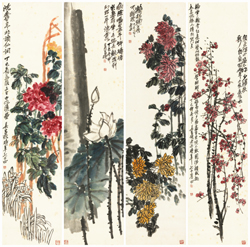 吳昌碩 花香四時(shí) 紙本立軸 1917年作 出 版: 《日本藏吳昌碩金石書畫精選》P134-135,西泠印社出版社,2004年。 備注:王震題盒。 133×33 cm×4 約4.0平尺(每幅) |