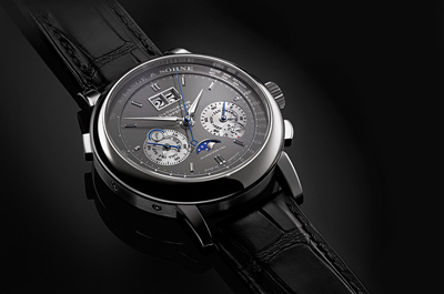 Perpetual的特色之一,這次更搭配18K黃金鍍銠棒形小時(shí)刻度、時(shí)針和分針。計(jì)時(shí)指針顯示出準(zhǔn)確至五分之一秒的停動(dòng)時(shí)間,并由藍(lán)鋼打造而成。積分盤和秒針亦選用了相同材質(zhì),在小表盤的銀灰色背景上格外醒目。由556個(gè)精細(xì)零件組成的機(jī)芯,進(jìn)一步印證了來(lái)自薩克森的朗格表廠在復(fù)雜制表裝置領(lǐng)域的精湛技藝。