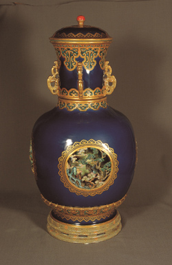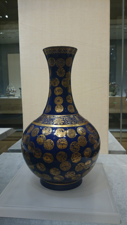 南京博物院鎮(zhèn)院之寶:清乾隆 藍釉描金粉彩開光轉心瓶 |