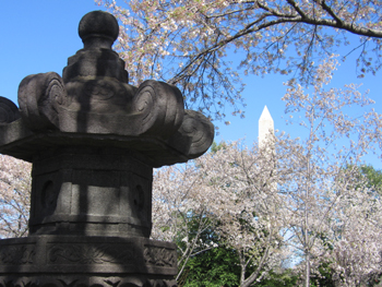 湖畔林中,水光瀲滟、樹影婆娑。在1912年由兩位夫人手植的兩株櫻樹附近,有一石燈及一石塔,均系花崗巖材質(zhì)。燈矮塔高,皆是來自日本的古物。九重檐佛塔兩米多高,塔上蓮花和櫻花圖案依稀可辨,但祭奠文字早已模糊不清。具體年代不詳,屬于鐮倉時(shí)代的典型禪宗藝術(shù)風(fēng)格。佛教西來東土,在中國(guó)被改良成本土禪宗。南宋時(shí),禪宗傳入日本。石燈高一米多,原立于東京寬永寺內(nèi)。它造于1651年(順治八年),是為祭奠去世的日本德川幕府第三代將軍家光,其祖父即赫赫有名的德川家康。一對(duì)石燈,一在華盛頓,一在上野公園內(nèi)的寛永寺遺址。1945年的東京大轟炸導(dǎo)致大火,寺毀燈存。