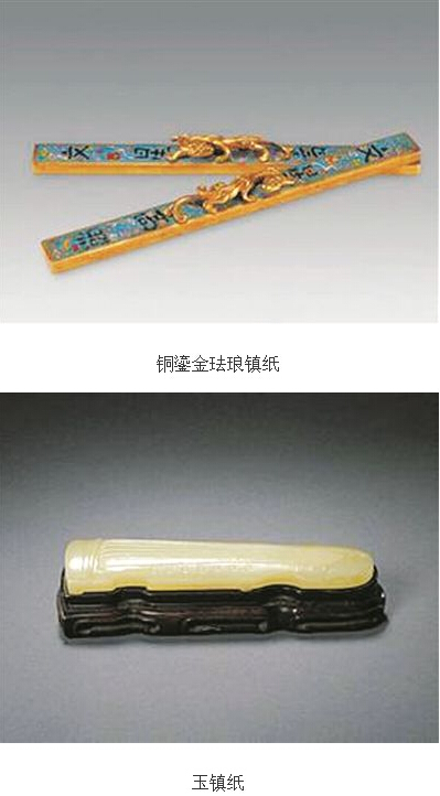 例如,宋岳珂的《愧郯錄·鎮(zhèn)小殿子》中有云:“御前列金器,如硯匣、壓尺、筆格、糊板、水漏之屬,計金二百兩!彼未鷱堥C的詩中也有“三山放翁寶贈我,鎮(zhèn)紙恰稱金犀!。宋周密的《武林舊事·車駕幸學》中說“……內(nèi)宮進牙界方”?梢姎v史上鎮(zhèn)紙的材質(zhì)有銅、象牙、金等,形狀各異。