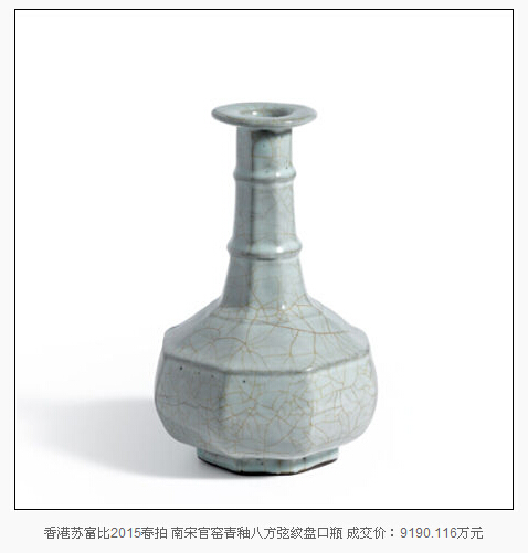 2015年已經(jīng)過半,藝術(shù)市場上各大拍行春拍也相繼收槌。瓷器板塊,香港蘇富比春拍一件南宋官窯青釉八方弦紋盤口瓶以1億1388萬港元(約合9190萬人民幣)的成交價占據(jù)2015上半年的排行榜頭名,這一價格也成為宋代瓷器歷史第三高拍賣成交價。高古瓷器的市場走高也被相當(dāng)一部分業(yè)內(nèi)人士認為是古瓷市場回歸理性的征兆。