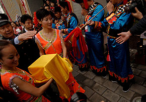 “萬壽龍團(tuán)貢茶”到達(dá)返鄉(xiāng)之旅的第一站北京宣武區(qū)馬連道茶葉一條街面向市民展出。本報(bào)記者 李石磊