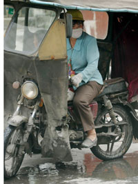 圖為大廠鎮(zhèn)的一載客三輪車,口罩是司機(jī)常年必備的防污工具。本報(bào)記者:張愛林
