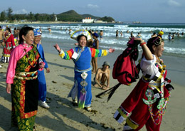 西藏游客大東海海濱游覽。本報(bào)記者:姜恩宇 攝 |