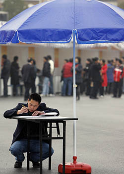 | 農(nóng)民工職介專場招聘會上,求職者在現(xiàn)場填寫表格。新華社記者 劉穎
