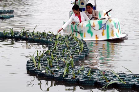 合肥市杏花公園人工湖里由1600多個(gè)圓形生物浮床組成的十組水生植物浮島建成。在浮島上種植水生植物可以提高城市景觀水體的自凈能力,解決富營(yíng)養(yǎng)化問(wèn)題。新華社發(fā)(馬啟兵攝) | 合肥市,居皖之中、緊鄰巢湖,是我國(guó)惟一的濱臨五大淡水湖的省會(huì)城市。為保護(hù)好母親湖巢湖,合肥市近年來(lái)以科學(xué)發(fā)展觀為指導(dǎo),大手筆、大投入,在城區(qū)開展一場(chǎng)前所未有的治污運(yùn)動(dòng):污水處理廠從無(wú)到有、從少到多;大型工業(yè)企業(yè)從強(qiáng)制治污到主動(dòng)治污或搬出市區(qū);從單一的治理污水到立體治污、防污……2005年至2008年,這個(gè)市工業(yè)增加值從292億元激增到609億元,而工業(yè)廢水排放量則銳減70%。 面對(duì)金融危機(jī)影響,合肥市仍堅(jiān)持環(huán)保投入不減少,將水環(huán)境治理與路橋工程、民生工程并列,納入重點(diǎn)大建設(shè)范疇,2009年全市計(jì)劃安排38億元用于環(huán)保投資,接近于“十五”期間環(huán)?偼顿Y量,力爭(zhēng)到2010年,不讓一滴污水流入巢湖。