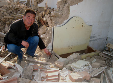 呼和浩特市玉泉區(qū)堿灘村一位村民手抓廢墟中的茶幾腿說(shuō),自家房屋于2009年4月13日凌晨被強(qiáng)行拆除時(shí),床、柜等不少用品被埋。