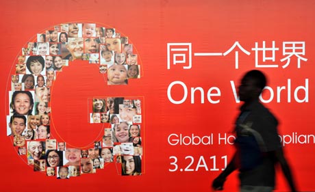 一位廣交會(huì)的客商經(jīng)過(guò)格蘭仕公司的廣告燈箱。本報(bào)記者 壯錦