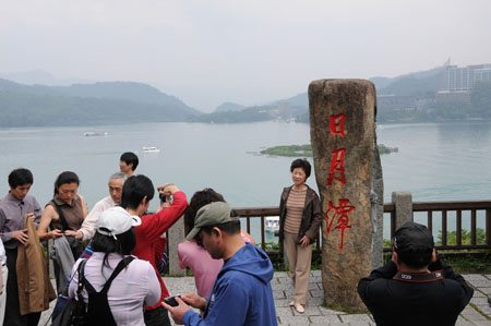 一群來自上海的游客在臺(tái)灣“日月潭”字碑前排隊(duì)留影。新華社記者 余福卿 攝 |