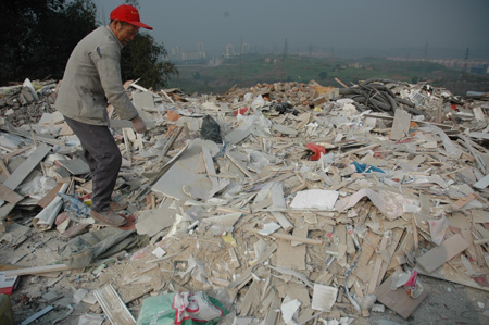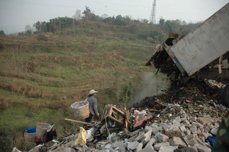 重慶市環(huán)衛(wèi)局副局長(zhǎng)胡瑞茂介紹,重慶主城區(qū)建筑垃圾的產(chǎn)生主要有兩個(gè)渠道:一是拆遷產(chǎn)生的建筑廢料,二是基建工地開槽土石方。為規(guī)范建筑垃圾的處置,重慶市環(huán)衛(wèi)部門在主城區(qū)附近指定了14個(gè)建筑垃圾收納場(chǎng),要求建設(shè)單位必須用專業(yè)運(yùn)渣車將垃圾運(yùn)到消納場(chǎng)堆放處理。然而,開發(fā)建設(shè)單位往往將建筑垃圾以一定的價(jià)錢承包給運(yùn)輸公司,而一些運(yùn)輸公司為降低運(yùn)輸成本,不愿將垃圾運(yùn)送到指定地點(diǎn),隨意傾倒在路邊、空地或河邊等地,逐漸形成了建筑垃圾圍城之勢(shì)。胡瑞茂無(wú)奈地說(shuō),盡管環(huán)衛(wèi)執(zhí)法人員經(jīng)常開展執(zhí)法檢查,但這些運(yùn)渣車輛總是與執(zhí)法人員玩“貓捉老鼠”的游戲。