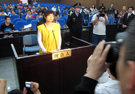 今年4月16日,浙江省金華市中級(jí)人民法院一審首次開庭,審理被稱為“東陽(yáng)富姐”的吳英涉嫌集資詐騙3.8億余元案件。圖為吳英出庭受審。本報(bào)記者黃深鋼攝 |