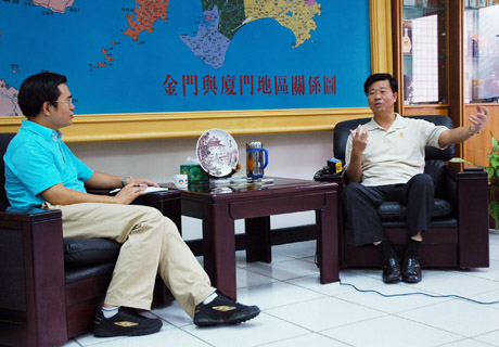2008年10月8日,金門(mén)縣長(zhǎng)李炷烽(右)在金門(mén)接受赴臺(tái)駐點(diǎn)采訪的新華社、《人民日?qǐng)?bào)》記者采訪時(shí)表示:“金門(mén)應(yīng)變成兩岸合作發(fā)展的‘和平島’。雙方可合作在金門(mén)、廈門(mén)之間建設(shè)和平博物館。過(guò)去炮口相向,現(xiàn)在可把雙方原來(lái)的武器擺在一起,槍口、炮口都對(duì)著天,訴說(shuō)人類(lèi)追求和平的決心!毙氯A社記者