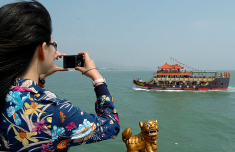 2006年10月4日,游客在拍攝金廈海域“成功”號(hào)仿古游船。“十一”黃金周期間,廈門(mén)市“游金廈海域,覽兩岸風(fēng)光”海上觀光項(xiàng)目每天都吸引了近萬(wàn)游人。游客乘上游船,廈門(mén)與金門(mén)兩岸風(fēng)光盡收眼底。新華社記者