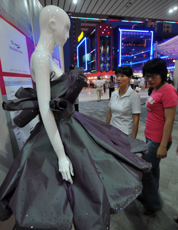 在杭州舉辦的“大學生DIY創(chuàng)意展”上,參觀者被一件杭州大學生設計制作的服飾吸引。新華社記者王定昶 攝