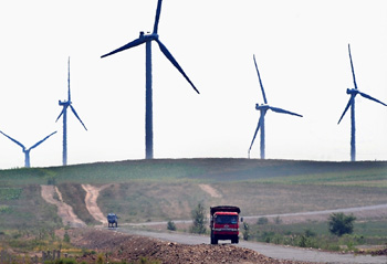 兩輛汽車行駛在內蒙古自治區(qū)境內風力發(fā)電機組臨近的公路上。新華社記者王頌