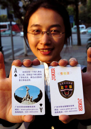當(dāng)日起,廣東省廣州市勞動(dòng)保障局將印有《勞動(dòng)法》內(nèi)容的8萬(wàn)副撲克牌陸續(xù)發(fā)放給轄區(qū)內(nèi)的農(nóng)民工。