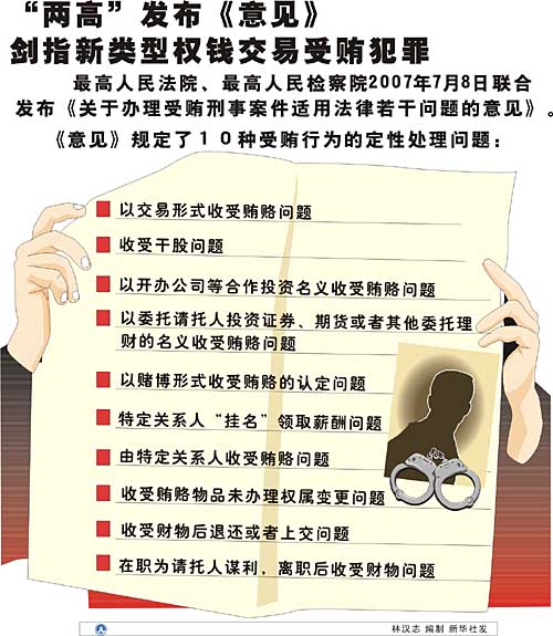 中共中央紀(jì)委副書記夏贊忠日前接受新華社記者采訪時(shí)曾指出,近幾年來,各級(jí)紀(jì)檢機(jī)關(guān)在辦案實(shí)踐中發(fā)現(xiàn),權(quán)錢交易的違紀(jì)違法案件出現(xiàn)了不少新情況、新特點(diǎn),違紀(jì)違法者的手法不斷翻新,形式變化多樣,更具隱蔽性。由“公開”轉(zhuǎn)為“私下”、由“直接”變?yōu)椤伴g接”、由“現(xiàn)貨”變?yōu)椤捌跈?quán)”。 這使得現(xiàn)有法律和黨規(guī)在適用上不夠明晰。有鑒于此,中共中央紀(jì)委發(fā)布《若干規(guī)定》,提出嚴(yán)禁“利用職務(wù)便利以交易形式收受請(qǐng)托人財(cái)物”、“利用職務(wù)上的便利收受請(qǐng)托人提供的干股”等8種權(quán)錢交易形式和認(rèn)定這些違紀(jì)行為的具體政策界限 而最高司法機(jī)關(guān)8日發(fā)布的《意見》,則在嚴(yán)格把握“受賄的權(quán)錢交易本質(zhì)”和“寬嚴(yán)相濟(jì)刑事政策”的基礎(chǔ)上,明確了10種新類型受賄行為的定性處理問題。 《意見》明確,國家工作人員利用職務(wù)上的便利為請(qǐng)托人謀取利益,以交易形式非法收受請(qǐng)托人財(cái)物;收受請(qǐng)托人提供的干股;由請(qǐng)托人出資或者沒有實(shí)際出資和參與管理、經(jīng)營,以“合作”開辦公司或者進(jìn)行其他“合作”投資名義收受出資或者“利潤”;以委托請(qǐng)托人投資證券、期貨或者其他委托理財(cái)?shù)拿x,未實(shí)際出資而獲取“收益”,或者雖然實(shí)際出資,但獲取“收益”明顯高于出資應(yīng)得收益;要求或者接受請(qǐng)托人以給特定關(guān)系人安排工作為名,使特定關(guān)系人不實(shí)際工作卻獲取所謂薪酬;授意請(qǐng)托人以本意見所列形式,將有關(guān)財(cái)物給予特定關(guān)系人等行為,均應(yīng)以受賄論處。 《意見》規(guī)定,根據(jù)商品經(jīng)營者事先設(shè)定的各種優(yōu)惠交易條件,以優(yōu)惠價(jià)格購買商品的,不屬于受賄。對(duì)于以賭博形式實(shí)施的受賄,應(yīng)當(dāng)綜合賭博的背景、場合、時(shí)間、次數(shù)以及賭資來源和其他賭博參與者有無事先通謀等因素進(jìn)行認(rèn)定;對(duì)于未辦理權(quán)屬變更的受賄,應(yīng)當(dāng)綜合借用事由、實(shí)際使用與否、借用時(shí)間長短、有無歸還的條件、意思表示及行為等因素進(jìn)行認(rèn)定。 《意見》強(qiáng)調(diào),國家工作人員利用職務(wù)上的便利為請(qǐng)托人謀取利益之前或者之后,約定在其離職后收受請(qǐng)托人財(cái)物,并在離職后收受的,以受賄論處;國家工作人員利用職務(wù)上的便利為請(qǐng)托人謀取利益,離職前后連續(xù)收受請(qǐng)托人財(cái)物的,離職前后收受部分均應(yīng)計(jì)入受賄數(shù)額。