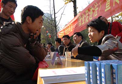 12月2日,余姚市勞動(dòng)部門(mén)工作人員(右)在受理一名男青年的咨詢。當(dāng)天是浙江省余姚市規(guī)定的“外來(lái)務(wù)工人員日”,為了配合即將頒布的新《勞動(dòng)合同法》宣傳,余姚市工會(huì)及勞動(dòng)和社會(huì)保障部門(mén)的法律專家走上街頭,義務(wù)為外來(lái)務(wù)工人員宣傳新法,并提供咨詢服務(wù)。 | |