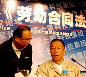 | 富士康科技集團(tuán)12日在深圳舉行《勞動(dòng)合同法》專題論壇,邀請(qǐng)勞動(dòng)部、國(guó)臺(tái)辦、全國(guó)總工會(huì)等相關(guān)部門的專家解答了企業(yè)和員工的疑問(wèn)。富士康表示,將積極實(shí)施《勞動(dòng)合同法》,與數(shù)萬(wàn)已連續(xù)工作8年以上的員工簽訂無(wú)固定期限勞動(dòng)合同。富士康科技集團(tuán)總裁郭臺(tái)銘(右者)在研討會(huì)上表示,富士康將積極實(shí)施《勞動(dòng)合同法》,全力推動(dòng)有富士康特色的勞動(dòng)合同制度,創(chuàng)造勞資雙贏、留住人才的局面,同時(shí)積極履行《勞動(dòng)合同法》規(guī)定的法律責(zé)任,做到合法經(jīng)營(yíng)。新華社記者