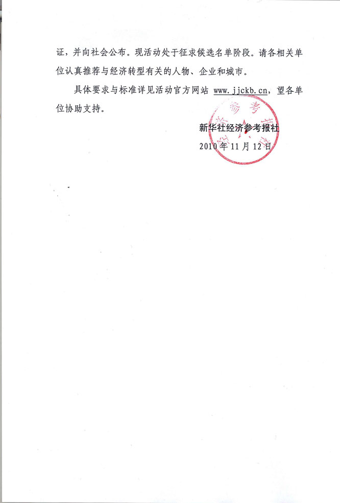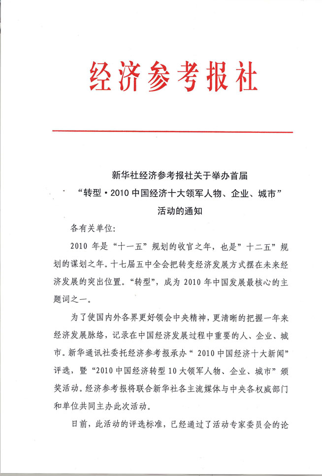 首屆“轉(zhuǎn)型2010中國經(jīng)濟十大領(lǐng)軍人物、企業(yè)、城市”活動通知