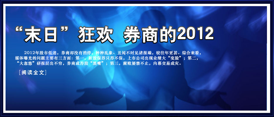 | 據(jù)《投資快報(bào)》報(bào)道,2012年即將收官,回看今年的“金股”,券商們重磅推薦的“金股”近八成出現(xiàn)不同程度的下跌,其中逾六成個(gè)股跑輸上證指數(shù)。其中,被平安證券指名的多只“金股”領(lǐng)跌大市,可謂2012年最會(huì)忽悠的券商了。 |
