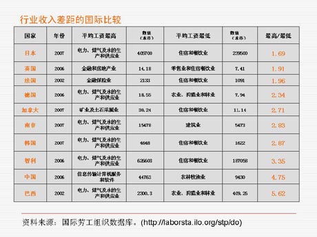 與國(guó)際相比,日本最高比值是1.69倍,英國(guó)是1.91倍,法國(guó)1.96倍,德國(guó)2.23倍,加拿大2.71倍,巴西比較高是5.62倍。我們總是擔(dān)心中國(guó)陷入拉美式的經(jīng)濟(jì)陷阱,然而,根據(jù)國(guó)家統(tǒng)計(jì)局發(fā)布的今年第一季度最新行業(yè)平均工資數(shù)據(jù),可以計(jì)算出我國(guó)收入最高的行業(yè)是證券業(yè),是全國(guó)平均水平的5.9倍,金融業(yè)是平均工資的3倍。而較低的木材加工業(yè)只有全國(guó)平均水平的53.6%,紡織業(yè)是全國(guó)平均水平的55.5%,農(nóng)副產(chǎn)品是60.1%,最高與最低行業(yè)平均工資之比是11比1,遠(yuǎn)遠(yuǎn)超過(guò)巴西。