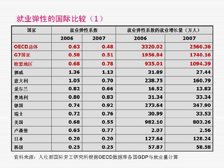 再和國(guó)際上進(jìn)行比較,根據(jù)人力資源和社會(huì)保障部國(guó)際勞工研究所對(duì)OECD數(shù)據(jù)庫(kù)和各國(guó)GDP就業(yè)量的計(jì)算,一般發(fā)展中國(guó)家就業(yè)彈性平均在0.3-0.4,發(fā)達(dá)國(guó)家2007年歐盟地區(qū)總就業(yè)彈性是0.78,OECD國(guó)家是0.48。這說(shuō)明我們這種經(jīng)濟(jì)增長(zhǎng)方式對(duì)帶動(dòng)就業(yè)的促進(jìn)作用,與發(fā)達(dá)國(guó)家相比差太多了,中國(guó)基本上是全世界就業(yè)彈性最低的國(guó)家。
