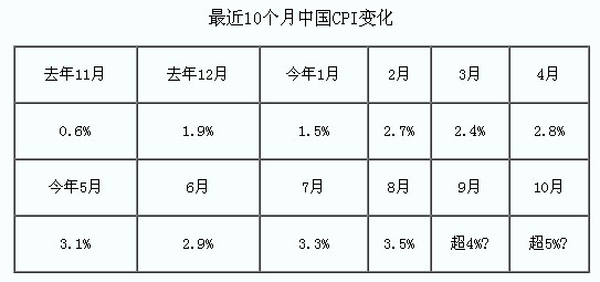 然而,4萬億的中央投資計劃、十大產(chǎn)業(yè)振興規(guī)劃,以及10萬億的新增貸款投放,極大地刺激了中國經(jīng)濟的快速復(fù)蘇與CPI的持續(xù)反彈。自2009年11月以來,中國CPI已連續(xù)上漲10個月,并有不斷攀升之勢。