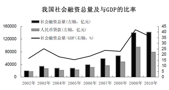 統(tǒng)計(jì)數(shù)據(jù)顯示,我國(guó)社會(huì)融資總量快速擴(kuò)張,金融對(duì)經(jīng)濟(jì)的支持力度明顯加大。從2002年到2010年,我國(guó)社會(huì)融資總量由2萬(wàn)億元擴(kuò)大到14.27萬(wàn)億元,年均增長(zhǎng)27.8%,比同期人民幣各項(xiàng)貸款年均增速高9.4個(gè)百分點(diǎn)。2010年社會(huì)融資總量與GDP之比為35.9%,比2002年提高19.2個(gè)百分點(diǎn)。金融體系對(duì)實(shí)體經(jīng)濟(jì)的支持力度明顯加大(見(jiàn)圖)。社會(huì)融資總量快速增長(zhǎng)的同時(shí),金融結(jié)構(gòu)也多元化發(fā)展,金融對(duì)資源配置的積極作用不斷提高。一是2010年企業(yè)債融資、非金融企業(yè)股票融資和保險(xiǎn)公司賠償分別占同期社會(huì)融資總量的8.4%、4.1%和1.3%,其中企業(yè)債融資比2002年上升6.8個(gè)百分點(diǎn)。二是商業(yè)銀行表外業(yè)務(wù)融資功能顯著增強(qiáng)。2010年銀行承兌匯票、委托貸款和信托貸款分別占同期社會(huì)融資總量16.3%、7.9%和2.7%,分別比2002年高19.8、7和2.7個(gè)百分點(diǎn)。