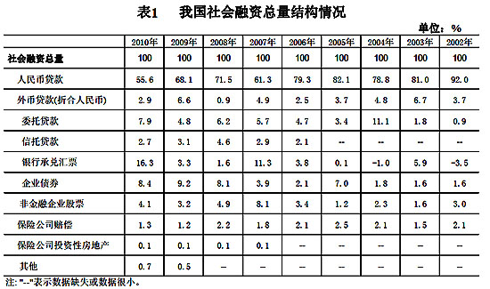 貨幣政策的最終目標(biāo)是促進(jìn)經(jīng)濟(jì)增長(zhǎng)、實(shí)現(xiàn)充分就業(yè)、保持物價(jià)穩(wěn)定和維持國(guó)際收支平衡。為了實(shí)現(xiàn)這一最終目標(biāo),一般都要根據(jù)一個(gè)國(guó)家的實(shí)際情況,確定合適的中間目標(biāo)。較長(zhǎng)時(shí)期以來(lái),我國(guó)貨幣政策重點(diǎn)監(jiān)測(cè)、分析的指標(biāo)和調(diào)控中間目標(biāo)是M2和新增人民幣貸款。在某些年份,新增人民幣貸款甚至比M2受到更多關(guān)注。然而由于新增人民幣貸款已不能準(zhǔn)確反映實(shí)體經(jīng)濟(jì)的融資總量,因此只有將商業(yè)銀行表外業(yè)務(wù)、非銀行金融機(jī)構(gòu)提供的資金和直接融資都納入統(tǒng)計(jì)范疇,才能完整、全面監(jiān)測(cè)和分析整體社會(huì)融資狀況,也才能從根本上避免因過(guò)度關(guān)注貸款規(guī)模而形成的“按下葫蘆浮起瓢”的現(xiàn)象,即商業(yè)銀行通過(guò)表外業(yè)務(wù)繞開(kāi)貸款規(guī)模。這些表外業(yè)務(wù)主要有銀行承兌匯票、委托貸款、信托貸款等。以2010年為例,全年新增人民幣貸款7.95萬(wàn)億元,同比少增1.65萬(wàn)億元,但是實(shí)體經(jīng)濟(jì)通過(guò)銀行承兌匯票和委托貸款從金融體系新增融資達(dá)3.47萬(wàn)億元,占社會(huì)融資總量的24.2%,同比多增2.33萬(wàn)億元(見(jiàn)表1)。