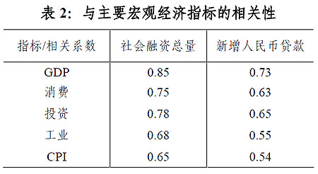 衡量一個(gè)指標(biāo)能否作為調(diào)控的中間目標(biāo),有兩個(gè)重要標(biāo)準(zhǔn),一是它與最終目標(biāo)的關(guān)聯(lián)性,二是它的可調(diào)控性。實(shí)證分析表明,與新增人民幣貸款相比,社會(huì)融資總量與主要經(jīng)濟(jì)指標(biāo)相互關(guān)系更緊密。衡量?jī)蓚(gè)變量之間的關(guān)系,在統(tǒng)計(jì)上一般采用相關(guān)性分析,測(cè)算得到的相關(guān)系數(shù)絕對(duì)值一般在0與1之間。相關(guān)系數(shù)越高,說(shuō)明兩個(gè)變量之間的關(guān)系越緊密。我們采用基于2002-2010年的月度和季度數(shù)據(jù),對(duì)社會(huì)融資總量、新增人民幣貸款與主要經(jīng)濟(jì)指標(biāo)分別進(jìn)行統(tǒng)計(jì)分析(見(jiàn)表2),結(jié)果表明:與新增人民幣貸款相比,我國(guó)社會(huì)融資總量與GDP、社會(huì)消費(fèi)品零售總額、城鎮(zhèn)固定資產(chǎn)投資、工業(yè)增加值、CPI的關(guān)系更緊密,相關(guān)性顯著優(yōu)于新增人民幣貸款。