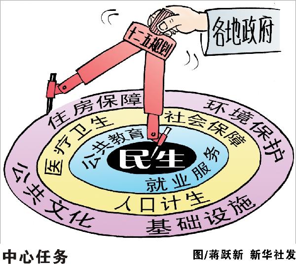 就業(yè)與社會保障、教育、醫(yī)療、住房等,在13億人口的國度里每一個都是世界級的難題。民生問題解決得好壞,關(guān)系著人民的福祉,關(guān)乎著民主的前途,決定著國家的命運(yùn)!笆濉币(guī)劃綱要明確提出:堅持把保障和改善民生作為加快轉(zhuǎn)變經(jīng)濟(jì)發(fā)展方式的根本出發(fā)點(diǎn)和落腳點(diǎn)。完善保障和改善民生的制度安排,把促進(jìn)就業(yè)放在經(jīng)濟(jì)社會發(fā)展優(yōu)先位置,加快發(fā)展各項社會事業(yè),推進(jìn)基本公共服務(wù)均等化,加大收入分配調(diào)節(jié)力度,堅定不移走共同富裕道路,使發(fā)展成果惠及全體人民。新華社發(fā)