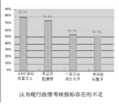總的來看,大多數(shù)受訪廳局級領(lǐng)導(dǎo)干部認(rèn)為現(xiàn)有政績考核方式不利于轉(zhuǎn)變經(jīng)濟(jì)發(fā)展方式。那么,現(xiàn)行考核方式中存在哪些不足呢?調(diào)查結(jié)果顯示,78.7%的領(lǐng)導(dǎo)干部認(rèn)為“反映GDP增值的指標(biāo)權(quán)重太大”。74.7%的領(lǐng)導(dǎo)干部選擇“重顯績輕潛績”,致使有些地方熱衷做“表面文章”,民眾無法有效共享發(fā)展的成果。53.7%的領(lǐng)導(dǎo)干部選擇“‘一票否決’項(xiàng)目太多”,地方領(lǐng)導(dǎo)有時畏手畏腳,難以全力以赴推動轉(zhuǎn)變經(jīng)濟(jì)發(fā)展方式。51.9%的領(lǐng)導(dǎo)干部選擇“考評指標(biāo)繁多”。