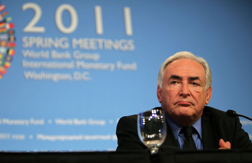 5月14日,國(guó)際貨幣基金組織(IMF)總裁多米尼克·斯特勞斯-卡恩因涉嫌對(duì)酒店女傭進(jìn)行“性侵犯”在美國(guó)紐約被拘捕。 圖為4月14日,斯特勞斯-卡恩在美國(guó)首都華盛頓出席新聞發(fā)布會(huì)的資料照片。(記者