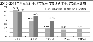 圖二:2010-2011年新股發(fā)行平均市盈率與市場(chǎng)總體比較