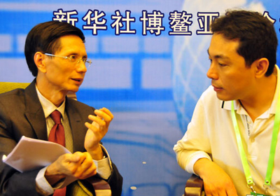 經(jīng)濟(jì)學(xué)家、成都大學(xué)副校長(zhǎng)張其佐(左)接受新華社博鰲高端訪談 新華網(wǎng) 黃丹 攝