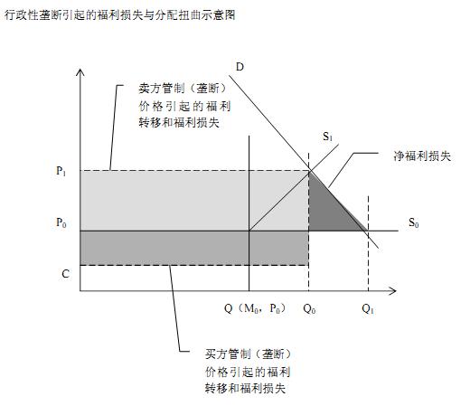 【說明:圖中深灰色部分是行政性壟斷帶來的社會福利凈損失,我們稱之為“社會福利損失一”;圖中淺灰色部分是由壟斷(管制)價格帶來的分配扭曲部分,我們稱之為行政性壟斷的“社會福利損失二”;圖中灰色部分是買方的壟斷(管制)價格(即較低或零的資源價格)帶來的分配扭曲,我們稱之為行政性壟斷的“社會福利損失三”!