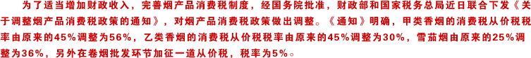 | 對于煙草全面專賣的中國來說,以煙草加稅增加財政收入,不如要求中國煙草總公司加大上繳利潤更合理。國稅總局提高了煙草生產(chǎn)的稅率,出發(fā)點是“適當增加財政收入,完善煙產(chǎn)品消費稅”。甲類香煙的消費稅率由原來的45%調(diào)整至56%。[詳細] | |