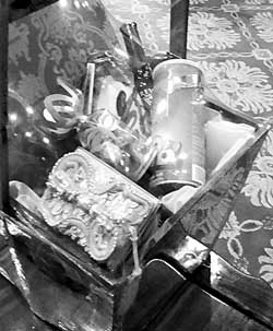 還有一家酒店,在手繪木質(zhì)月餅斗籃里,裝有花雕酒、鐵觀音茶、冰酒、御果和巧克力。銷售小姐稱,這個(gè)價(jià)格比每樣單買劃算多了,即便購買量大,也不打折。