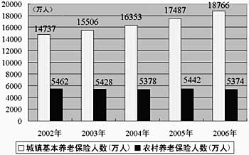 目前,養(yǎng)老保險已經(jīng)實現(xiàn)廣覆蓋。到2006年底,全國基本養(yǎng)老保險參保人數(shù)為18766萬人,城鎮(zhèn)參加企業(yè)基本養(yǎng)老保險覆蓋率達到76%。而且,基本養(yǎng)老金正常調(diào)整機制建立了起來。1998—2005年,企業(yè)參保離退休人員人均養(yǎng)老金水平由每月413元增加到719元,年均增長8.2%。2006年,中央決定較大幅度地提高企業(yè)退休人員基本養(yǎng)老金,當年月人均養(yǎng)老金達到815元。另外,統(tǒng)籌層次正逐步穩(wěn)定提高。截至2006年底,全國已有北京、天津、吉林、黑龍江、上海、福建、重慶、云南、陜西、甘肅、青海、寧夏、新疆13個省區(qū)市實現(xiàn)了省級統(tǒng)籌。但是,農(nóng)村養(yǎng)老保險的推進比較緩慢,覆蓋面還比較小。
