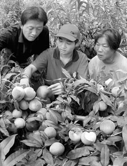 大學(xué)生志愿者高杰培在山西省夏縣瑤峰鎮(zhèn)大辛莊村向村民傳授桃樹的管理技術(shù)。薛俊
