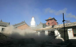 1月11日,在山西省忻州市五臺山景區(qū),工人們在五臺山大白塔下拆除房屋。為保護中國四大佛教圣地之一五臺山的“佛國”氛圍,中國已啟動一項大規(guī)模的拆遷工程,使?jié)庵氐纳虡I(yè)氣息從五臺山逐漸淡出,同時也為申報2008年世界自然和文化“雙遺產(chǎn)”做好準備。五臺山位于中國山西省的北部,梵宮琳宇構(gòu)成了東亞乃至世界現(xiàn)存最龐大的佛教古建群,僅五臺內(nèi)現(xiàn)存完好的寺院就有47座,為中國最早、最大的國際性佛教道場。