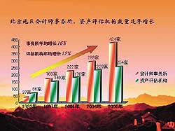 北京注協(xié)以高度的責(zé)任感和使命感,以科學(xué)的管理意識和誠信務(wù)實(shí)的工作作風(fēng),引領(lǐng)北京注冊會(huì)計(jì)師、注冊資產(chǎn)評估師行業(yè)朝著良性發(fā)展的方向發(fā)展,行業(yè)規(guī)模得以迅速壯大,位居全國行業(yè)領(lǐng)先地位。截至2006年底,北京注協(xié)共有會(huì)計(jì)師事務(wù)所428家,注冊會(huì)計(jì)師10799人,分別比上年增長15%和8%;資產(chǎn)評估機(jī)構(gòu)254家,注冊資產(chǎn)評估師2938人,分別比上年增長9%和6%;2005年度行業(yè)收入合計(jì)44.6億元,其中會(huì)計(jì)師事務(wù)所業(yè)務(wù)收入39.7億元,資產(chǎn)評估機(jī)構(gòu)業(yè)務(wù)收入4.9億元,比上年增長21%。在中國注冊會(huì)計(jì)師協(xié)會(huì)公布的2006年全國會(huì)計(jì)師事務(wù)所業(yè)務(wù)收入排名“百強(qiáng)”中,北京地區(qū)占據(jù)42家,其中7家進(jìn)入前10名。自2000年以來,業(yè)務(wù)收入連續(xù)位居全國前列,各種特種執(zhí)業(yè)資格亦獨(dú)占鰲頭。