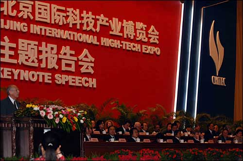 5月24日,以“創(chuàng)新與發(fā)展“為主題的第十屆“中國北京國際科技產(chǎn)業(yè)博覽會”在京開幕。為期六天的第十屆科博會由科技部、商務(wù)部等部門和北京市人民政府共同主辦,包括主題報告會、6萬平方米的高新技術(shù)展覽會、6場項目推介洽談、8個論壇和大型人才招聘交流等活動。這是諾貝爾物理學(xué)獎評委會主席!に谷f伯格在主題報告會上發(fā)言。