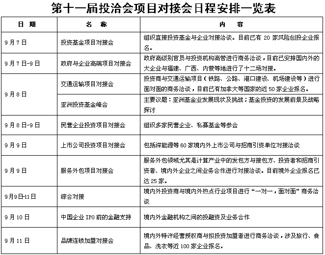 備注:項目對接會均可免費參加。有意者請直接聯(lián)系投洽會組委會,電話:0592-2669833,傳真:2669832,E-mail: