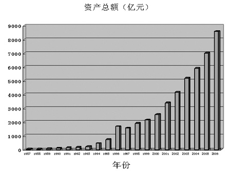 2006年底,全國財(cái)務(wù)公司資產(chǎn)規(guī)模為8581億元,較1987年的17億元增長了504倍。(見圖一)