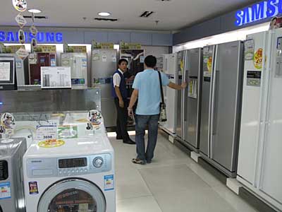 十一黃金周前后,三星家電最新產(chǎn)品盛裝上陣,在北京、上海、沈陽、廣州等地啟動主題為“三星到我家 美夢即成真”的大型促銷活動;顒拥闹鞔蛏唐钒∟8系列全高清液晶電視、“赫慕”雙開門冰箱、熱風(fēng)清新洗衣機(jī)、安德烈·金空調(diào)等。據(jù)悉,在活動期間,消費(fèi)者購買三星家電產(chǎn)品,可獲得豐富多樣的優(yōu)惠。圖為北京一賣場。