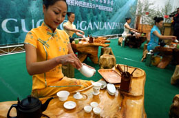甘肅隴南油橄欖產(chǎn)品展示會日前在蘭州舉行。隴南市是全國油橄欖最佳適生區(qū),也是中國優(yōu)質(zhì)油橄欖的主產(chǎn)區(qū)。2006年12月,隴南油橄欖獲得了由國家質(zhì)檢總局頒發(fā)的“地理標(biāo)志產(chǎn)品保護(hù)”專用標(biāo)志。圖為幾名茶藝師正在進(jìn)行油橄欖茶藝表演。